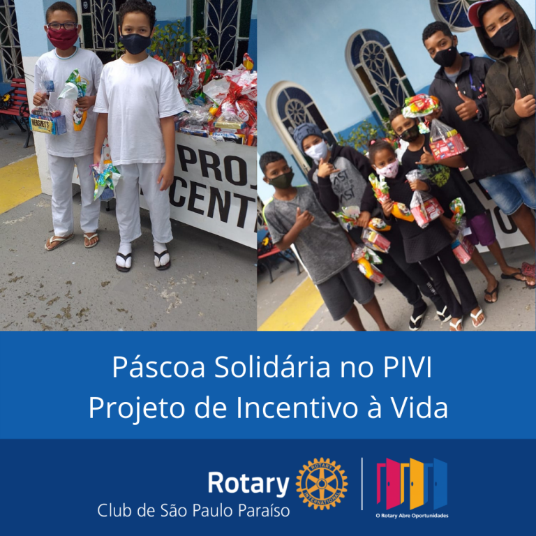 Páscoa Solidária - Entrega de 164 ovos de Páscoa à PIVI - Projeto de Incentivo à Vida, localizada na cidade de São Paulo, que realiza atividades educativas, culturais e esportivas com crianças e jovens em situação de vulnerabilidade social, contribuindo para a formação de cidadãos éticos, solidários, participativos e protagonistas de suas histórias. Somos rotarianos em ação!