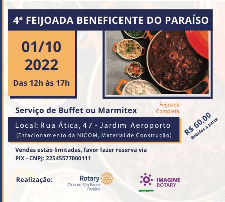 Convidamos a todos Rotarianos e não rotarianos para a tradicional Feijoada Beneficente do Rotary Club de São Paulo - Paraíso, a ocorrer no Estacionamento da NICOM - Material de Construção das 12:00 às 17:00 horas.