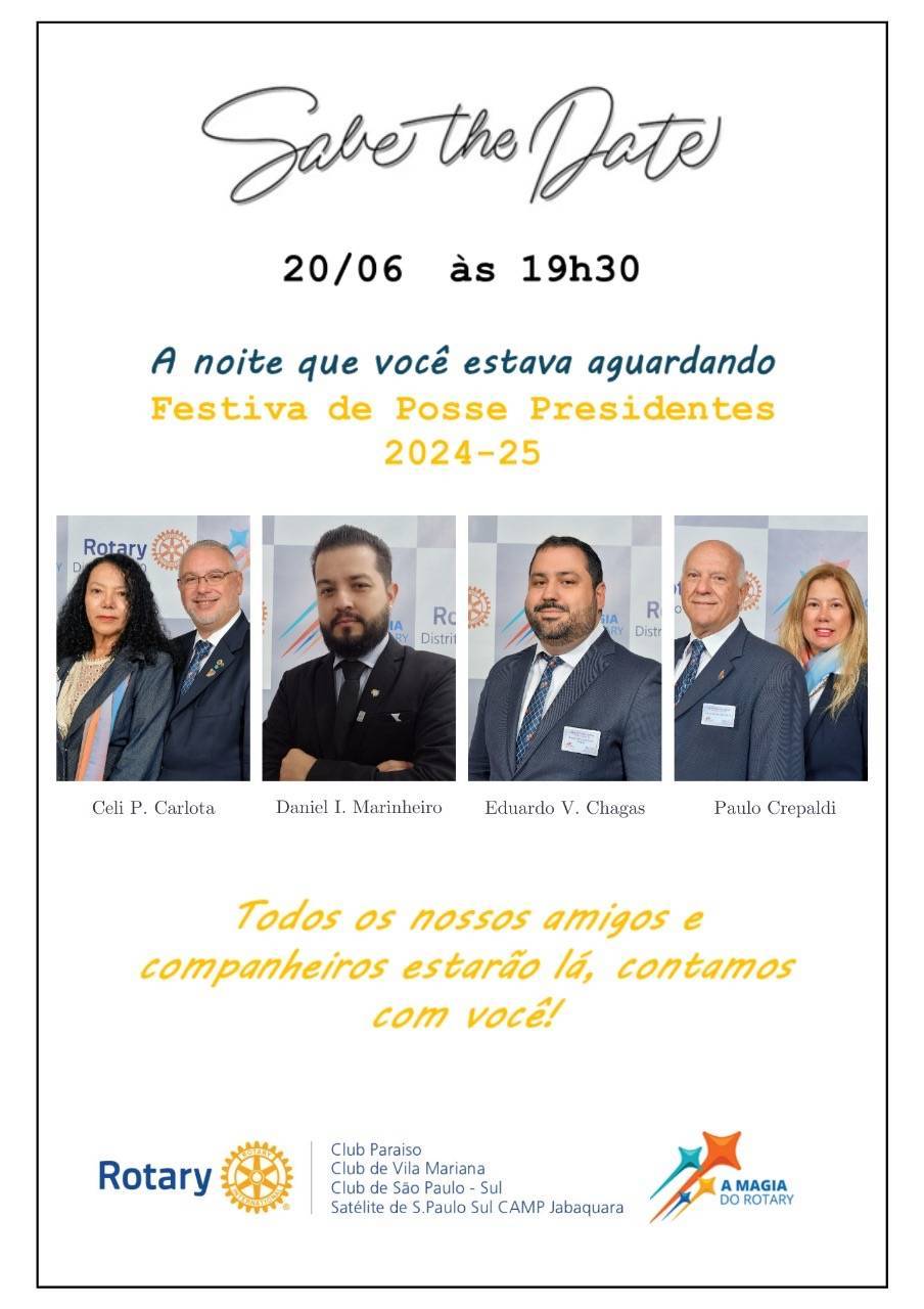 Convidamos a todos os companheiros, Rotarianos de outros clubes, amigos e familiares para a cerimônia de transmissão de posse conjunta dos clubes da área SP 01, RCSP - Paraíso, RCSP - Vila Mariana, RCSP - Sul e RC Satélite de SP - Sul CAMP Jabaquara, a ocorrer no dia 20/06/2024 a partir das 19h30 no salão principal do Colégio Rio Branco (5o andar), na Avenida Higienópolis, 996.