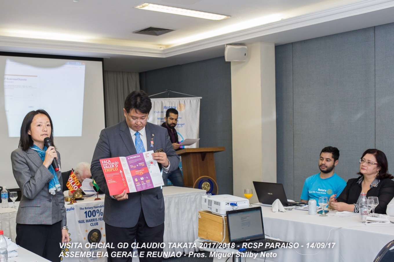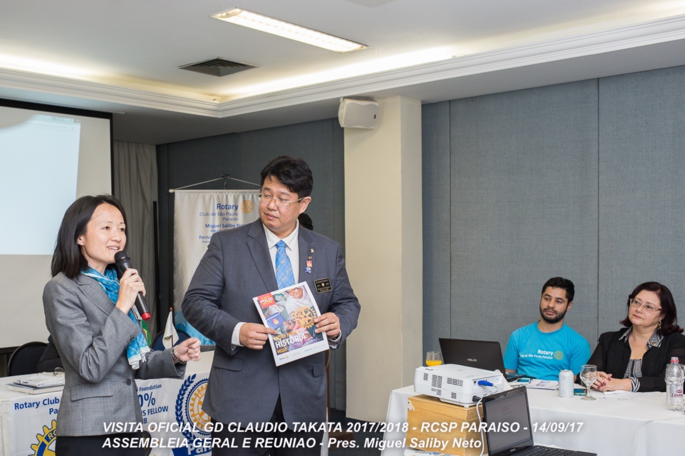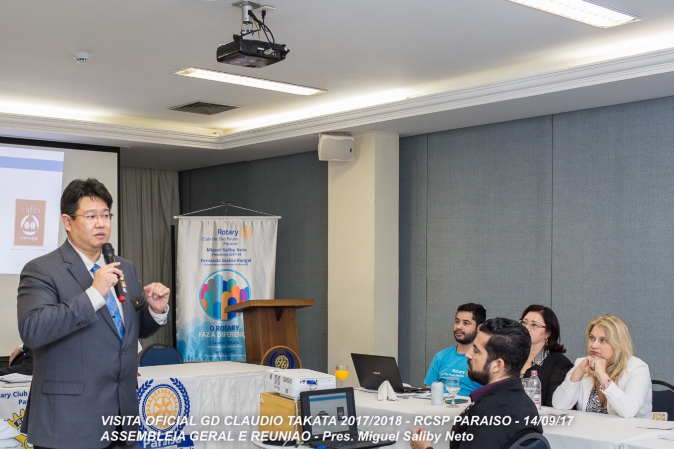 Após foi realizada à assembleia com integrantes da equipe rotária. Takata reforçou que para o novo ano rotário 2017-2018 foram definidas como prioridades as seguintes estratégias organizacionais: fortalecimento e apoio aos clubes; maior enfoque a expansão dos serviços humanitários como o reforço do combate a poliomielite, o plantio de árvores, aumento da projeção e imagem pública da organização, entre outros.