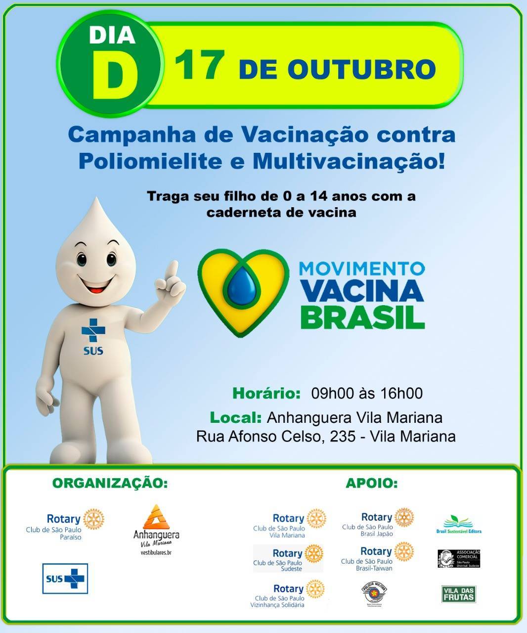 Multivacinação no dia D: 17/10/2020, das 9 às 16h, nas dependências da Universidade Anhanguera - Vila Mariana, São Paulo/Capital. Local: Rua Afonso Celso, 235.
